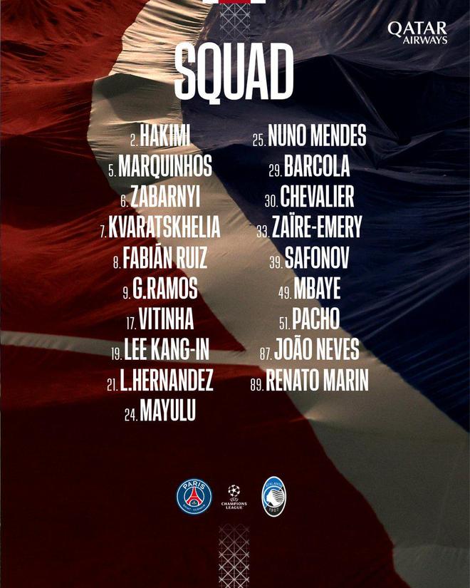 巴黎圣日耳曼官方公布了欧冠联赛首轮对阵亚特兰大的大名单,杜埃、登贝莱继续缺席。