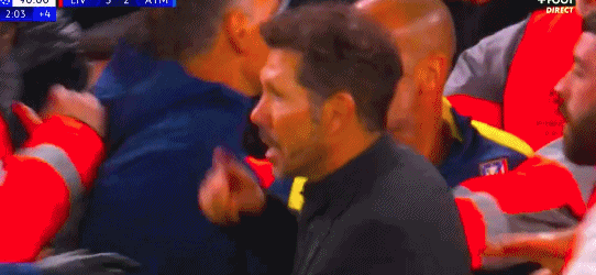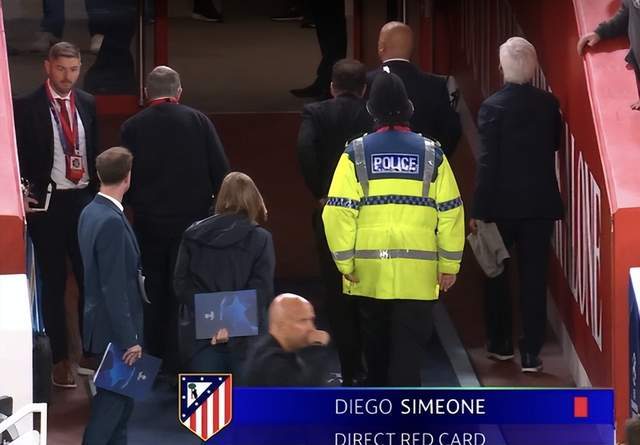 为防止事态严重化,警察出动,拉开西蒙尼并将马竞主帅送出球场。在利物浦球迷的起哄声中,匪帅带着不满、怒气走进球员通道。
