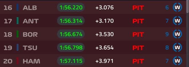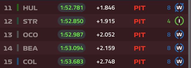 Q2上来皮亚斯特里一度刷紫,不过随着赛道变干,劳森和哈贾尔先后来到榜首,诺里斯也反超皮亚斯特里来到第三的位置。Q2结束时,拉塞尔冲到第一位,皮亚斯特里险些被淘汰。被淘汰的是霍肯伯格、奥康、比尔曼、克拉平托以及用半雨胎跑了4圈的斯特罗尔。