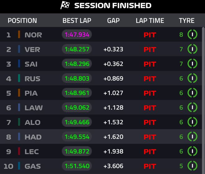 最终诺里斯取得杆位,维斯塔潘第二,塞恩斯第三,拉塞尔第四,皮亚斯特里第五,劳森第六,勒克莱尔仅仅位列第九。