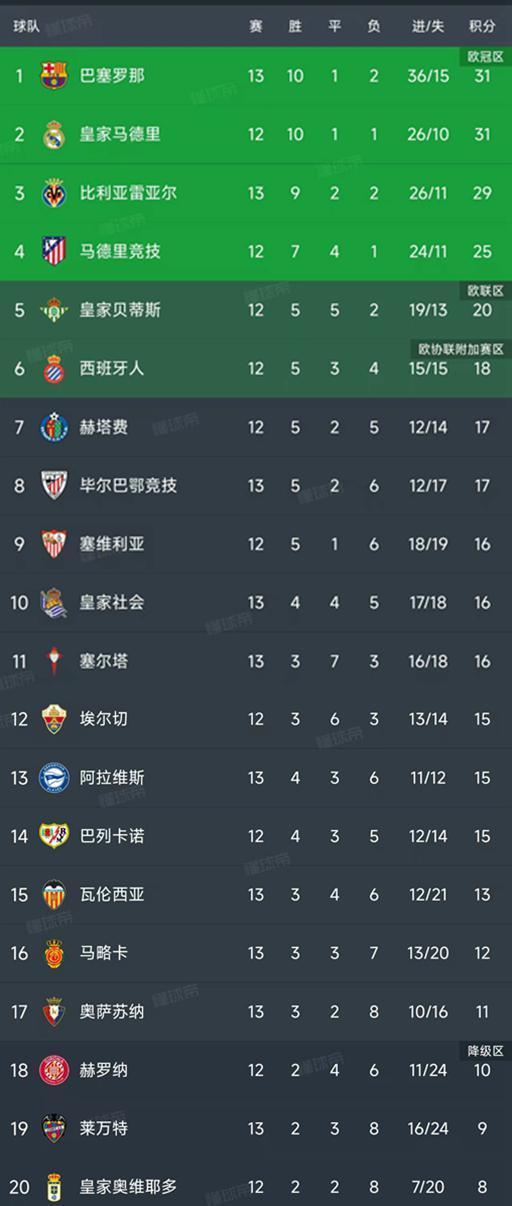 北京时间11月23日,西甲第13轮结束了5场比赛,最新积分榜如下!主要的信息是:巴萨4-0战胜毕尔巴鄂竞技,比利亚雷亚尔2-1马略卡,皇家社会3-1奥萨苏纳、阿拉维斯0-1塞尔塔、瓦伦西亚1-0莱万特。